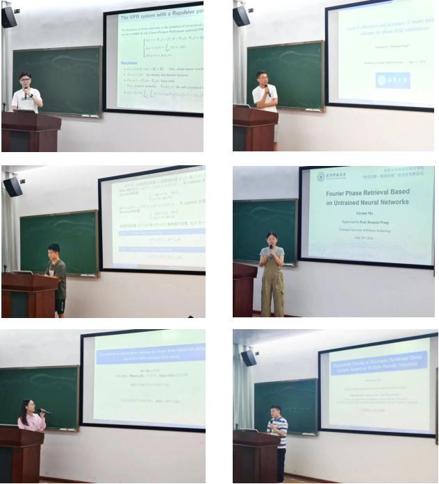 参与本次论坛的11位研究生分为上下两个半场进行汇报。在上半场,6位研究生从偏微分方程、发展方程数值方法、无训练神经网络等领域分别分享了自身的研究进展与成果。