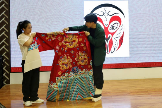 服饰展示环节,京剧老师向同学们分别展示了生角与旦角的服饰特点。生角服饰展现了武将的英武之气与文人的儒雅风度,而旦角服饰则以雍容华贵、灵动飘逸的水袖为特色,呈现了女性角色的柔美与端庄。