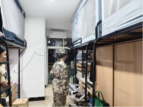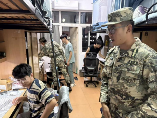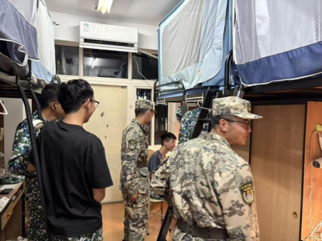 于10月15日晚组织开展了2025级新生军训内务检查。辅导员刘艺菲老师和军训教官共同参与,深入学生宿舍进行指导评估。