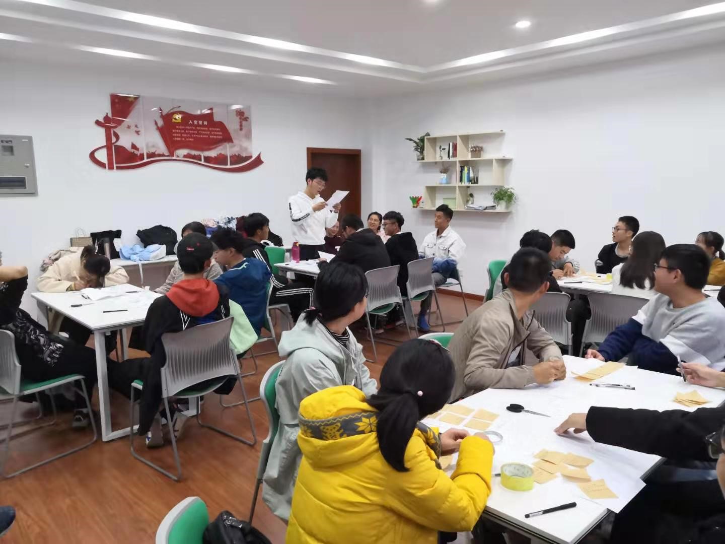 团辅开始前,同学们做了一个报数游戏,淘汰出八位同学演唱成都。接着,同学们通过抽取扑克牌被分为四组。分组后,同学们一起写下了心灵契约——帅气,有一说一,耐心等,这代表着本次团体辅导正式开始。