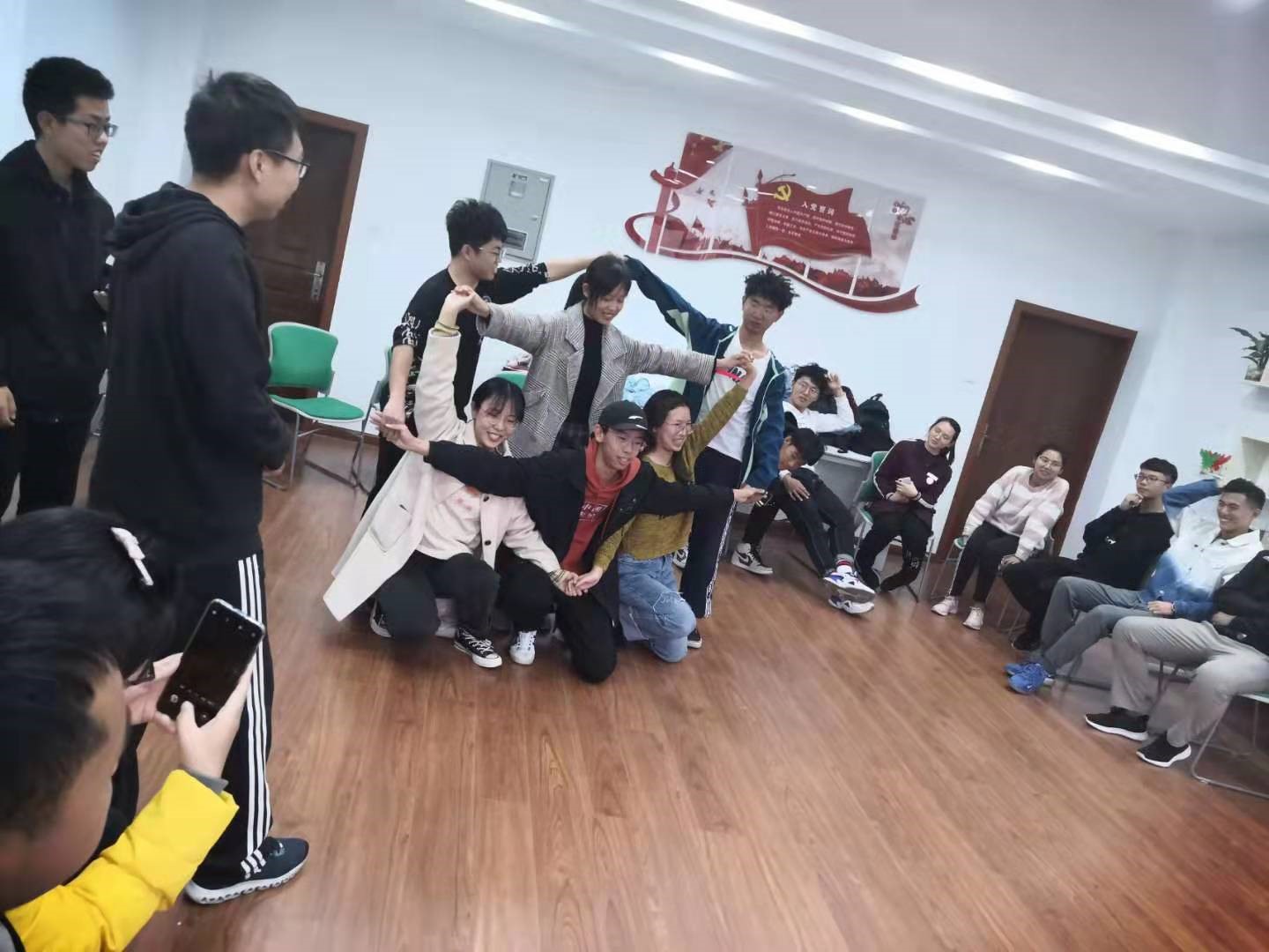首先,四组同学依次以“滚雪球”的方式进行自我介绍,用时最长的一组需要接受表演节目的惩罚。在正式开始比赛前,每个组在辅导室中间展示口号以及pose。这个环节给同学们提供了一次了解彼此的机会,并且增进了彼此的感情。