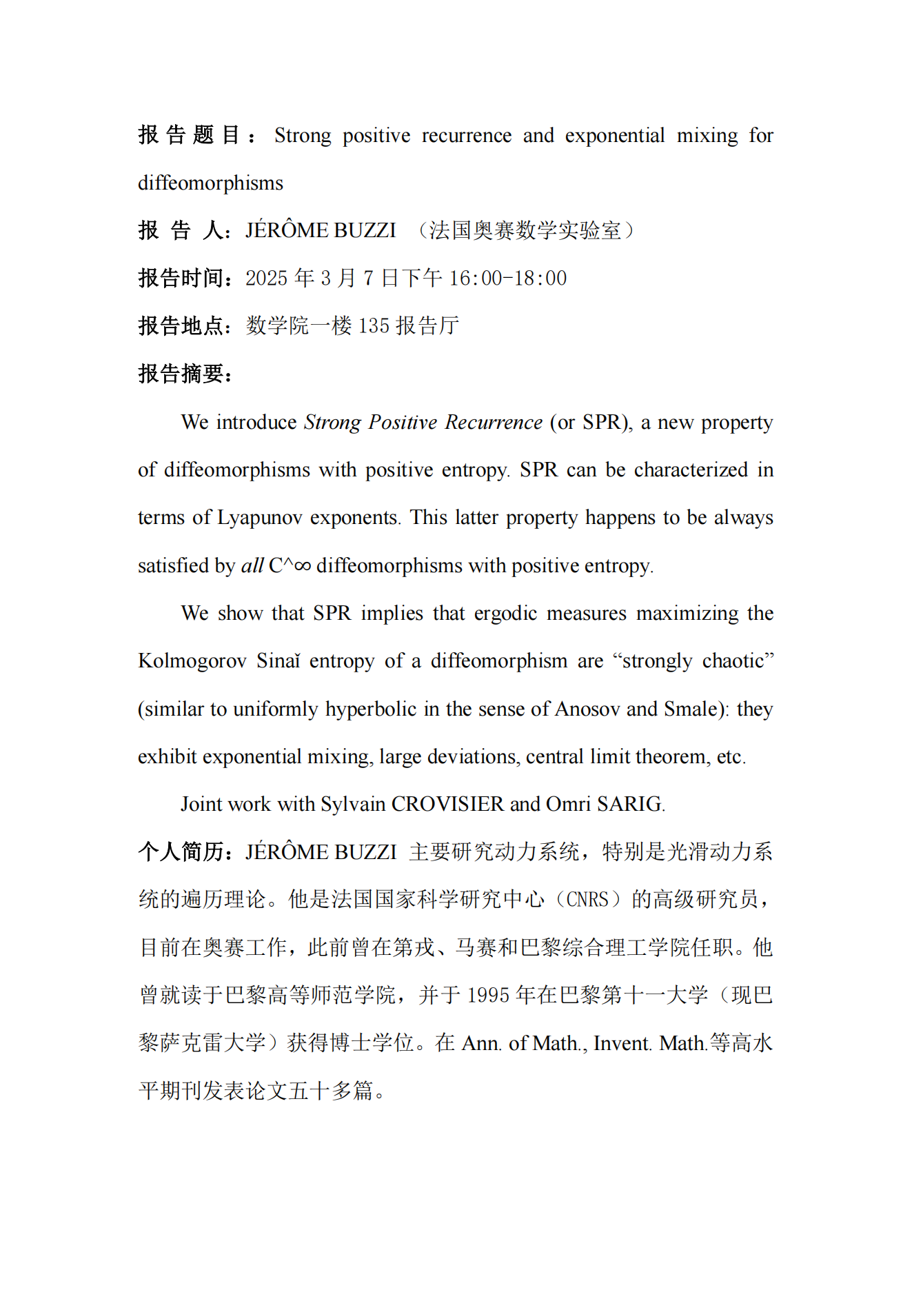 JÉRÔME BUZZI教授学术报告